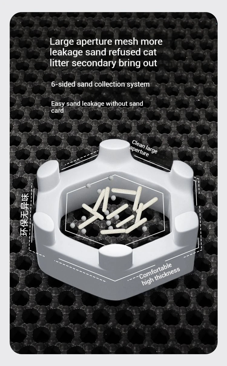 Ce tapis est facile à nettoyer : il suffit de le secouer pour enlever la litière coincée ou de le rincer à l'eau, ce qui rend l'entretien rapide et sans tracas. Sa grande taille permet de couvrir tous les types de bacs à litière, et sa conception imperméable protège vos sols des éclaboussures et des taches.